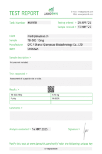 Each lot is sourced through our verified global supply chain with emphasis on traceability and quality control. We work diligently to obtain and maintain third-party analytical reports (HPLC/LC-MS) and Certificates of Analysis for each batch, as part of our ongoing quality process. These documents are reviewed internally and displayed as they become available. Independent third-party testing is also performed on select lots to confirm identity, purity, and alignment with our internal specifications.